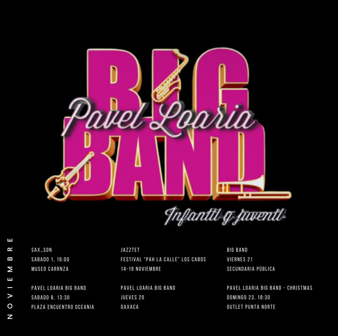 Pavel Loaria, saxofonista y director reconocido por tocar en el Carnegie Hall de Nueva York. Ha dado clases en Berklee College of Music de Boston MA. Nominado al Grammy latino, primer mexicano en estudiar en Jazz at Lincoln Center’s Band Director Academy y formar la primera Big Band Infantil y Juvenil de México.